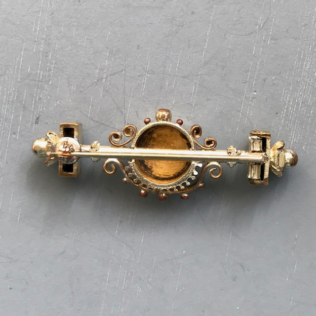 DescriptionVICTORIAN yellow gold filled floral etched round center bar pin with an etched floral design in the middle, applied scrolls and beaded edge, it is circa 1890s and 2" across. The flower may be a lily-of-the-valley. This antique brooch has wonderful detail for such a dainty piece and it would look good worn with sweetheart pins, which are a similar size. View Product #V27583