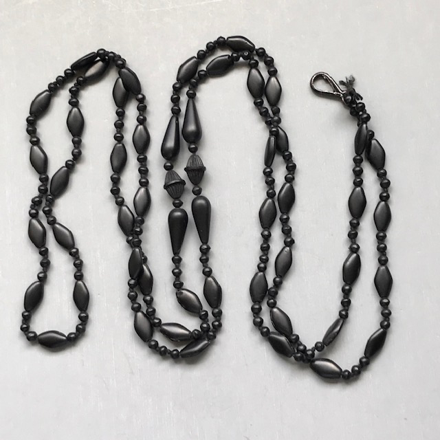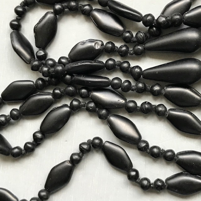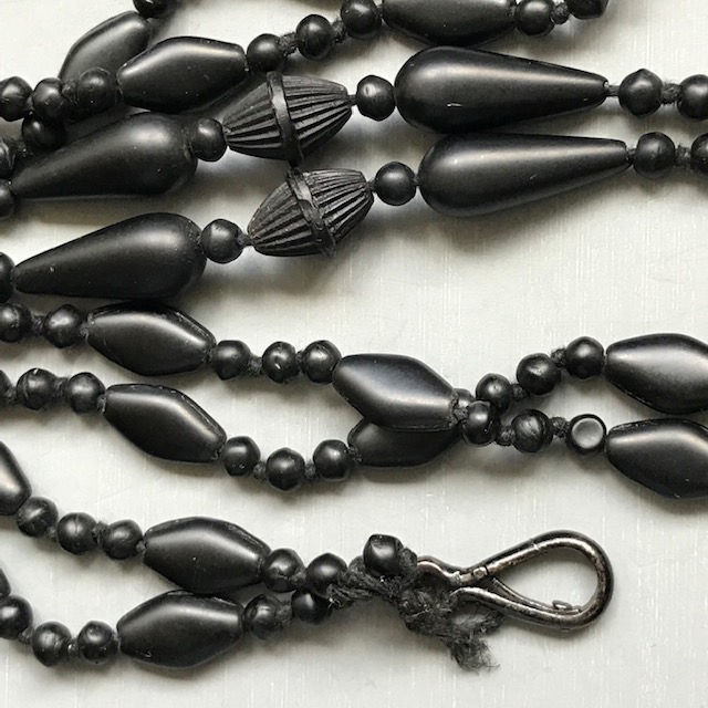 VICTORIAN black glass 56" long muff or lorgnette chain with very unusual "watermelon seed" or "crepe stone" beads, 56"