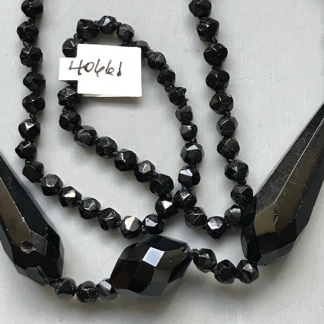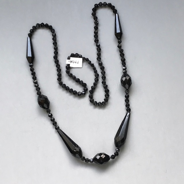 VICTORIAN black glass bead necklace with elongated teardrop shaped beads and faceted round ones, 29"