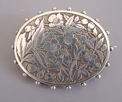 VICTORIAN floral locket brooch, and antique sterling silver oval brooch with etched designs of flowers and leaves and a detailed beaded edge
