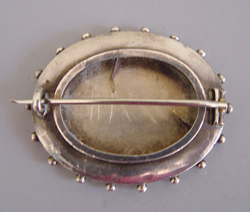 There is a locket compartment with a cover on back for a photo or a lock of hair. The brooch has a c-catch and tube hinge, circa 1880, 1-5/8" at the widest and it weighs about .35 ounces.
