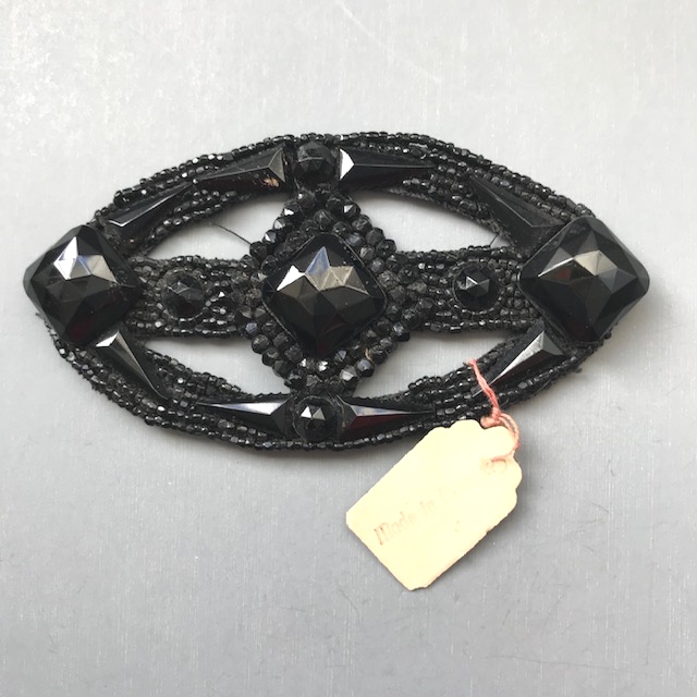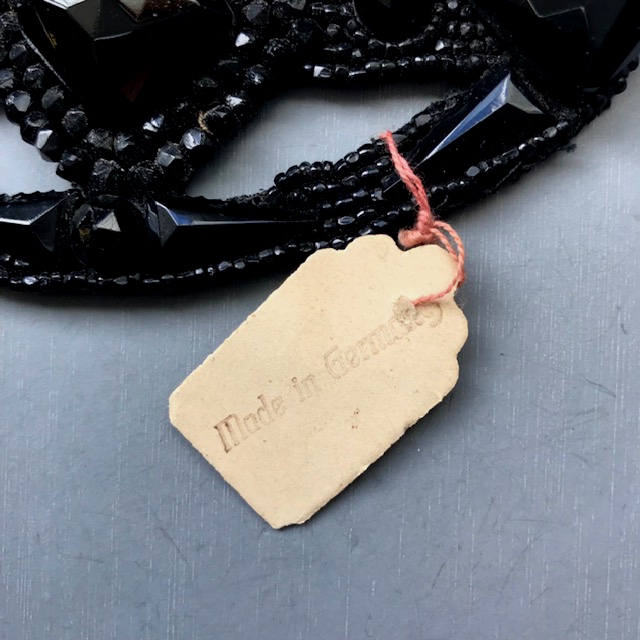 DescriptionVICTORIAN French jet black glass faceted beads and seed beads eye-shaped sew-on elements, a pair of two, both fabric backed. Each one is 4-1/2" by 2-1/3", and one has the original paper tag that says "Made in Germany" in faint printed letters with the number 10185 on the back, probably an inventory number. If you make period costumes or do reenacting, these would be a real treasure. They came from the wonderful collection of a lady who made costumes for the theater many years ago, and she had wonderful stories to tell.