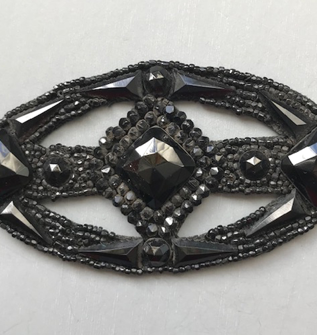 VICTORIAN French jet black glass faceted beads and seed beads eye-shaped sew-on elements, a pair of two