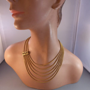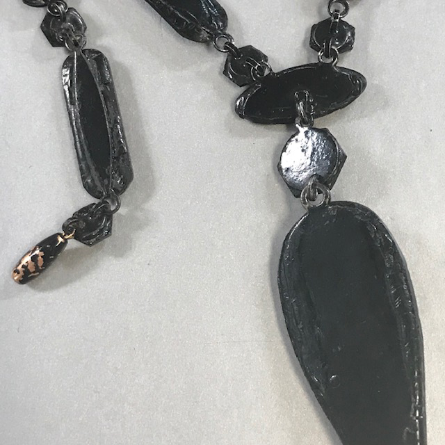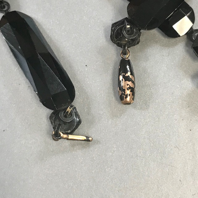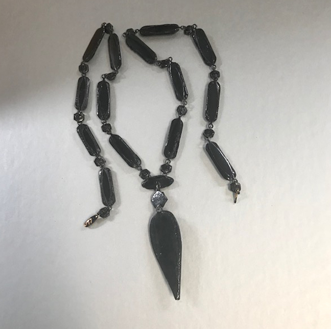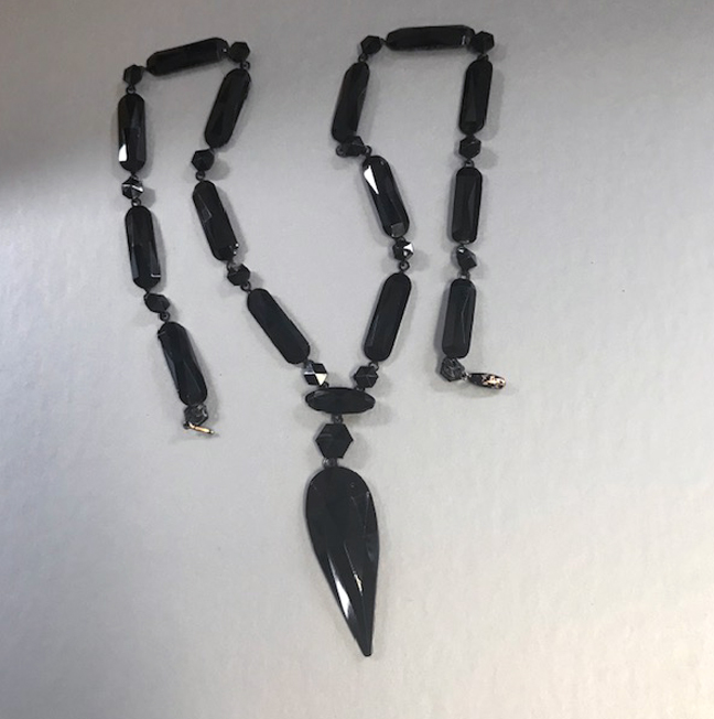 DescriptionVICTORIAN French jet (black glass) simple necklace, 22" long with a 2-3/4" front drop including all three segments. A great Gothic look! ViewViewViewView Product #41585