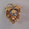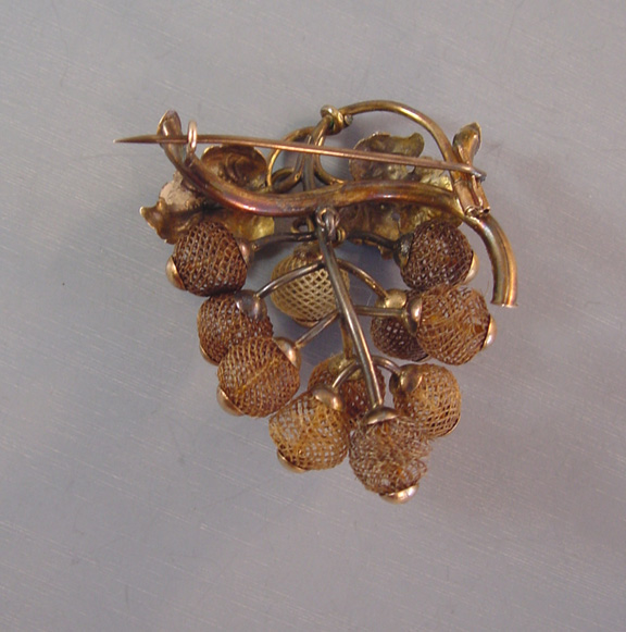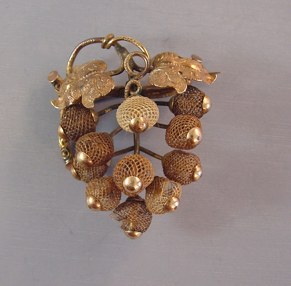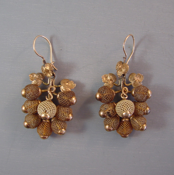 DescriptionVICTORIAN rare hair brooch and earrings with both blonde and brown hair in open woven berry balls set in gold leaves and fittings. Four of the balls on the brooch have hair that is coming unwoven a bit, brooch 2" by 1-3/4", earrings with a ball on one earring unraveling, 1-1/2" total length from the top of the loop to the very bottom of the earrings.