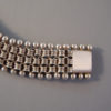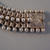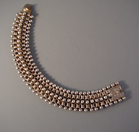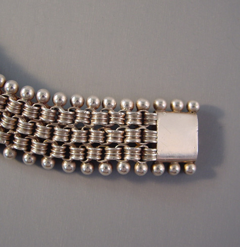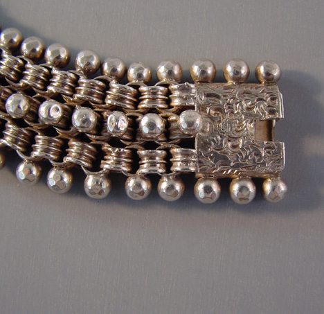 DescriptionVICTORIAN sterling silver bracelet with three beaded edges and an wonderful engraved foliate clasp, made in the 1880s, the wearable length 8" by 1" wide. There are some small dents in some of the beaded edging, visible under close examination. This is a similar style to the collars Victorian lockets were worn on. ViewView Product #V36956