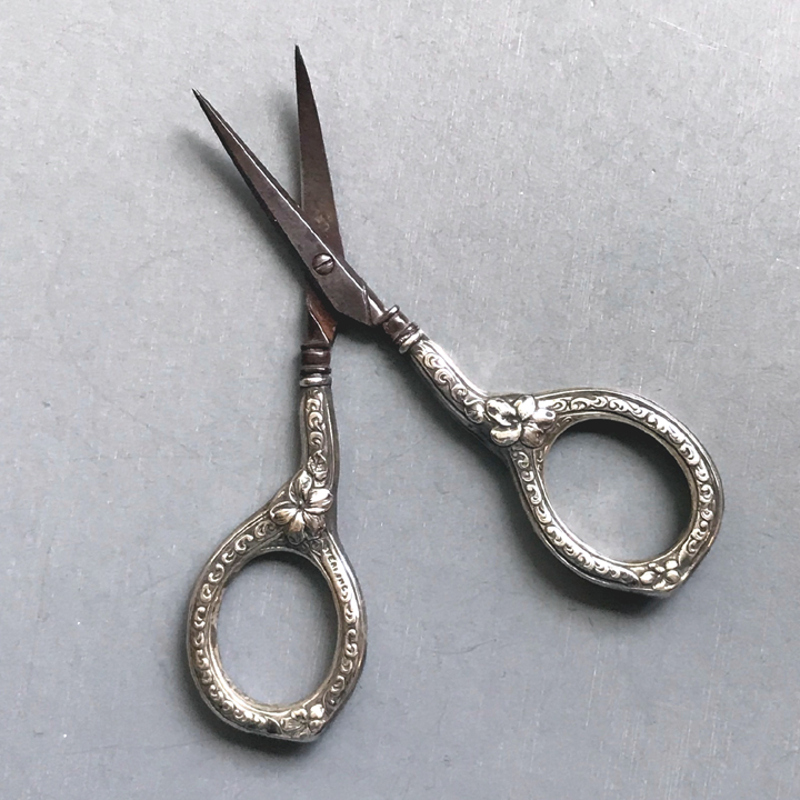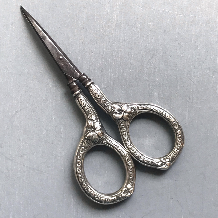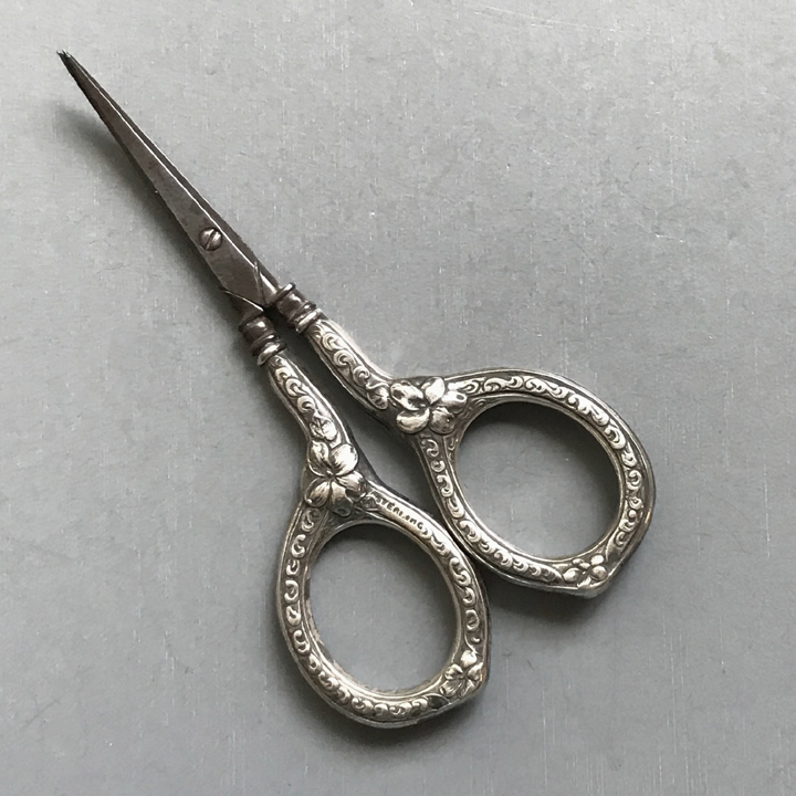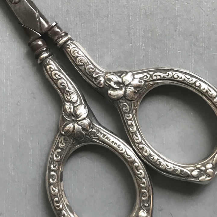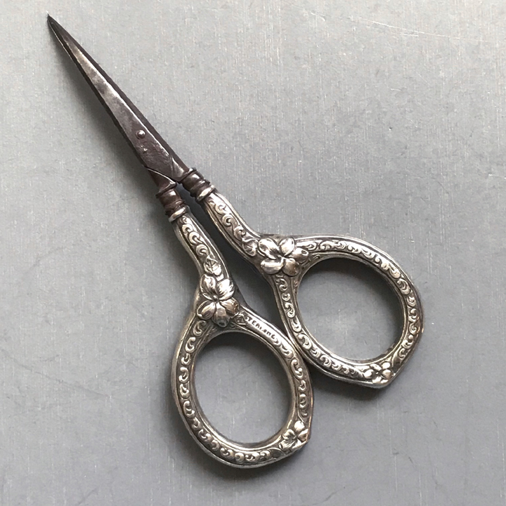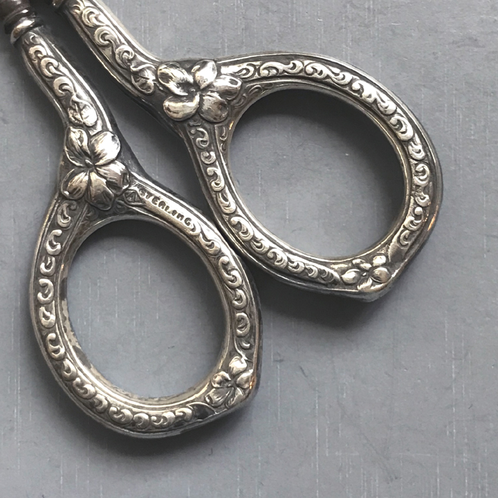 Description VICTORIAN sterling silver antique fingernail scissors with violet flowers and scroll designs on both sides, marked "sterling" 4" long.  These are sharp and cut well.  I use mine for cutting thread while I am sewing because it has a curved blade.  View  View  View  View  View