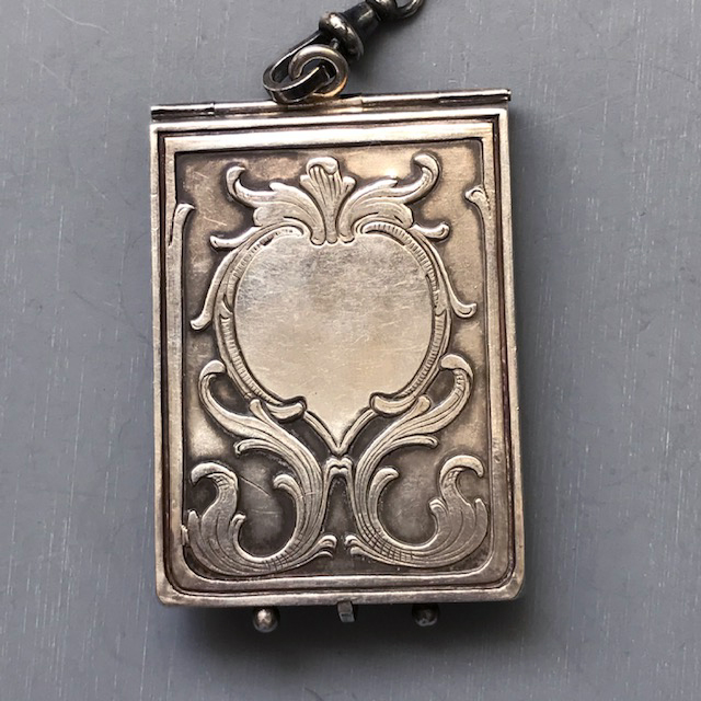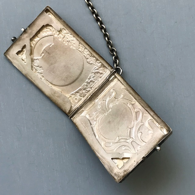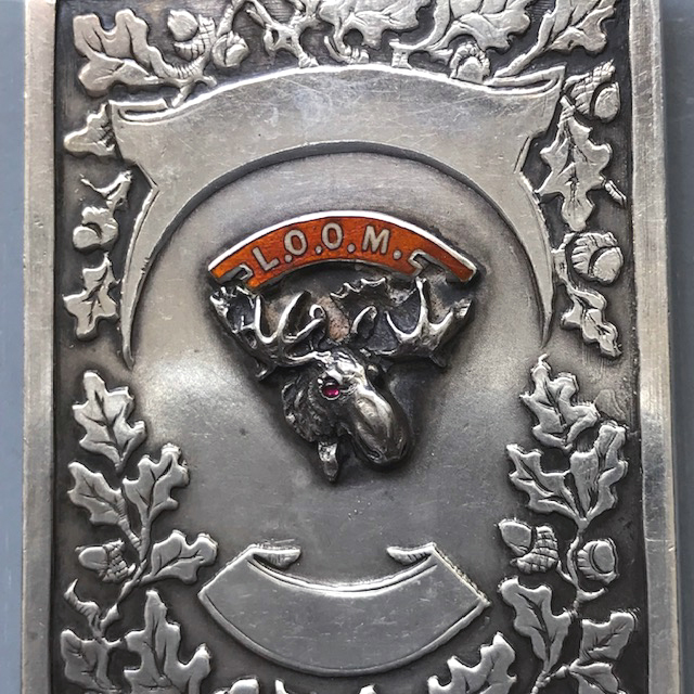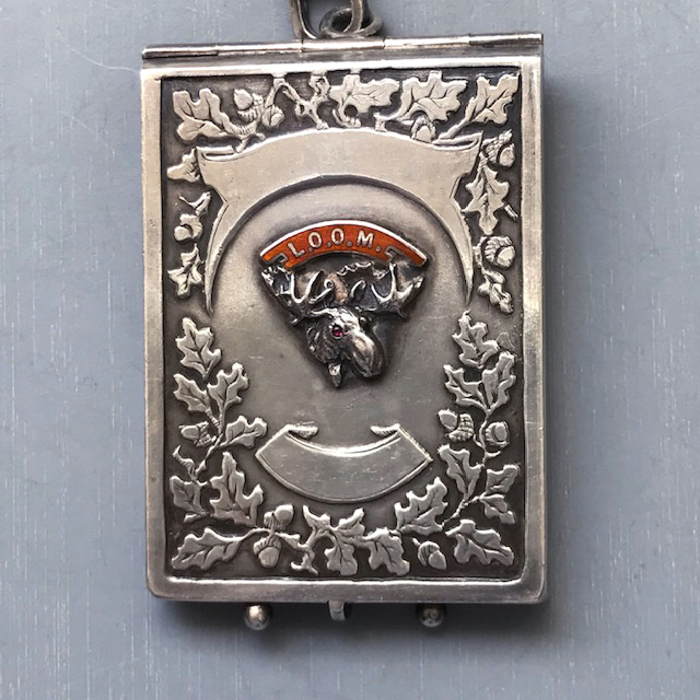 Description VICTORIAN signed sterling silver container to go on a chatelaine. It has a raised moose head with a little red rhinestone eye on the front and the letters "L.O.O.M'" for Loyal Order of Moose on a red enameled background. It's marked "sterling" with the maker's name "Alfred Schickerling Jew Co, Maiden Lane NY" and the date "Nov 22, 1910" on the inside.