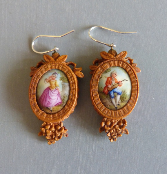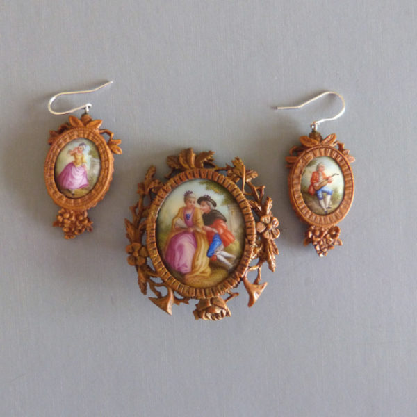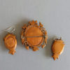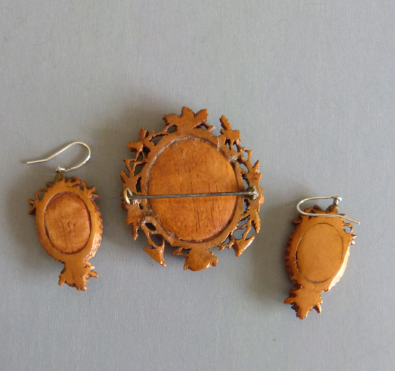 VICTORIAN Swiss carved boxwood set of brooch and earringsThe earrings are perfect but the brooch has some breaks in the twigs, hard to see unless examined closely. The brooch is 2" by 1-1/2" and the pierced earrings are 1-1/3" by 7/8". This is the first boxwood jewelry I had ever seen so it was exciting to find it. View View View View Product #V38611 All items in excellent vintage condition unless otherwise noted.
