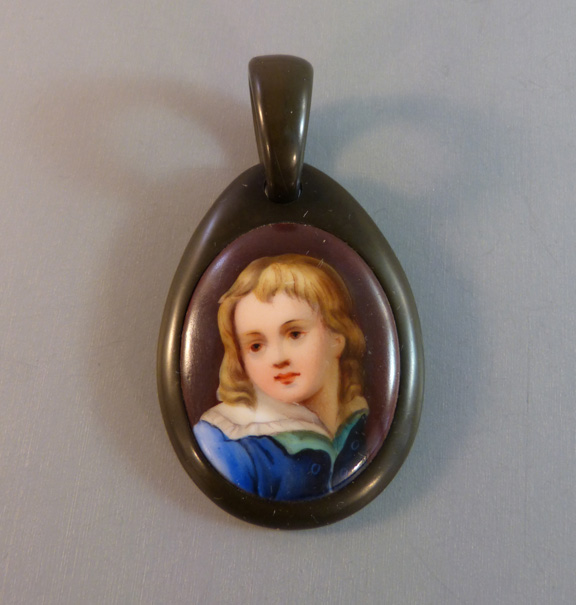 DescriptionVICTORIAN antique vulcanite pendant with a portrait of a child, a hand detailed transfer on porcelain. The total length with loop is 3" by 1-5/8" wide, so it is a larger size. Pendants like this could have been worn on a black ribbon tied around the neck back then, and it would be lovely that way now, too. The hand painted portrait wasprobably imported from Germany and placed in the setting in England, and was made in 1860 or 1870. View Product #V38478