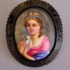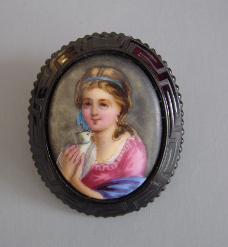 VICTORIAN Whitby jet antique portrait brooch of a beautiful lady hand painted on porcelain.  She is wearing pink and blue and holding a white dove