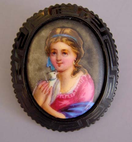 Description VICTORIAN Whitby jet antique portrait brooch of a beautiful lady hand painted on porcelain.  She is wearing pink and blue and holding a white dove.