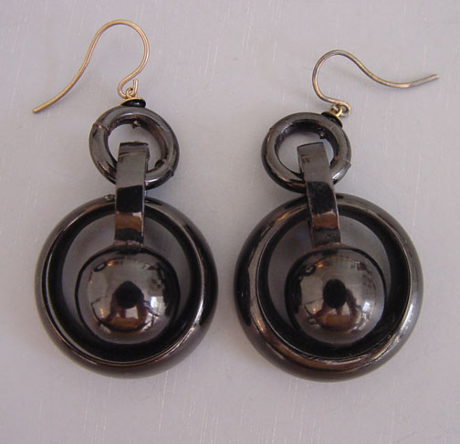 DescriptionVICTORIAN Whitby jet earrings with hand carved balls within circles, total length 1-7/8", length of jet portion 1-1/3". These are rare, complete with the original Victorian fittings just as they were made circa 1880. We bought them while visiting Whitby with the authors of the book about jet jewelry, and were delighted to get them.
