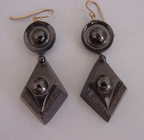 DescriptionVICTORIAN Whitby jet earrings, hand carved diamond shapes suspended from circles with applied faceted balls and carved edges, total length 2", jet portion 1-5/8". These are rare, complete with original Victorian fittings just as they were made circa 1880. We bought them while visiting Whitby with the authors of the two books about jet jewelry, and were delighted to get them.