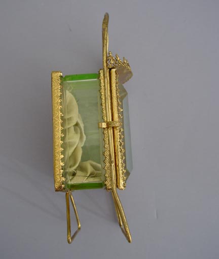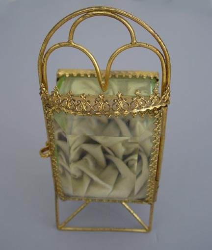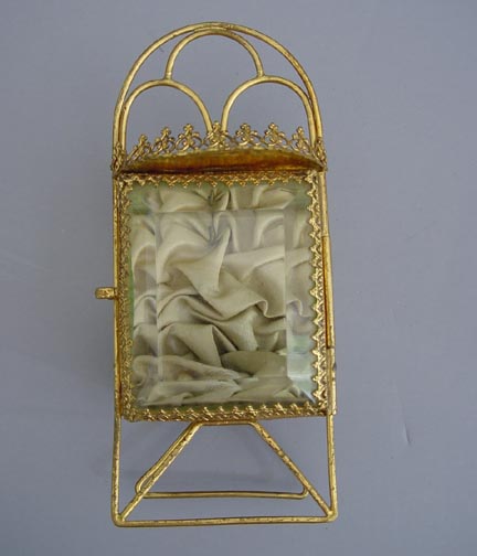 DescriptionWATCH holder lined in soft green tufted fabric, beveled glass hinged door and rippled thick glass sides and top, 5-1/3" total height, 2-1/2" wide. A hook inside holds your pocket watch or a special locket, and what a wonderful way to display a favorite piece of jewelry! ViewView Product #a32928