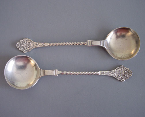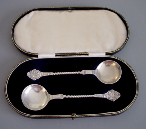 WS and Co late Victorian antique silver cased spoons set, a pair of spoons in fitted hinged boxProduct #33084 All items in excellent vintage condition unless otherwise noted.