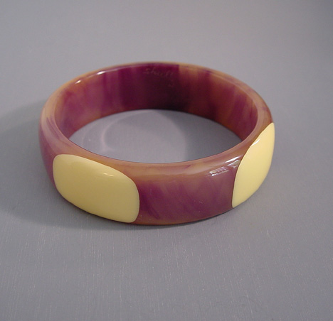 SHULTZ bakelite bangle in purple grape and cream custard swirl with 4 cream oval dots, 2-1/2″ by 1/2″ by 1/4″. The Shultzs’ started making bakelite jewelry in the 1980s and they make some pieces still. Ron Schultz creates his wonderful jewelry using only vintage circa 1940 bakelite, and every piece is his own original work. It is signed, … Continue reading “SHULTZ bakelite bangle in purple grape and cream custard”