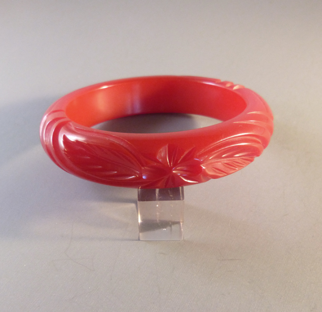 BAKELITE bangle in deep red, well carved and in very good condition, 2-1/2″ by 5/8″ by 1/3″ thick. This is circa 1940 and in very good condition. View #B39933 $198.00