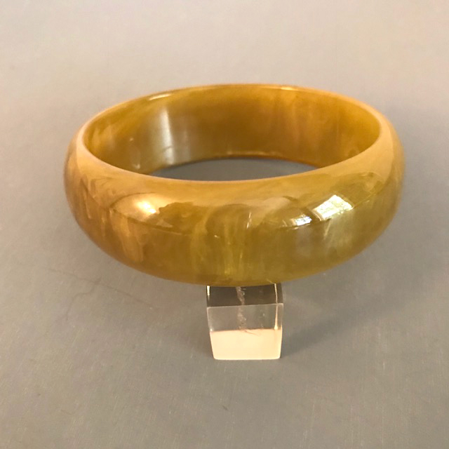 BAKELITE bangle in marbled swamp and Vaseline colors, , 2-1/3 one way and 2-5/8″ the other, 7/8″ wide and with 3/16″ walls. The color reminds me of cloudy honey, really nice. View #B66671 $28.00
