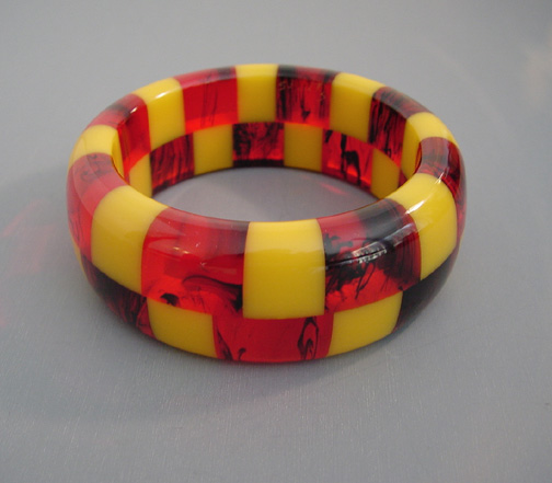 SHULTZ bakelite bangle made from parts that have been fashioned into a new bangle and signed both for Brandon Welch, who recreated it, and “S” for Shultz who originally made it. The bangle is 2-1/2″ by 1″ with 1/3″ walls. It has a contemporary sleek look with alternating cream and multicolored plaid and checks, really … Continue reading “SHULTZ/WELCH bakelite bangle alternating cream and multicolored plaid and checks”