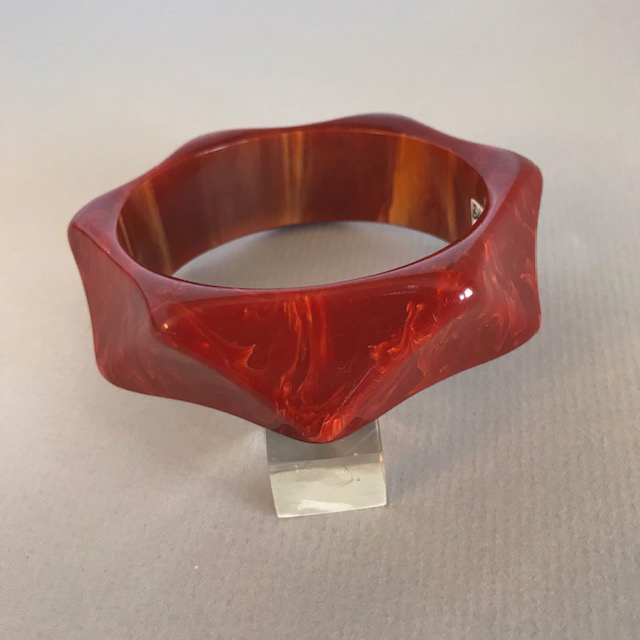 BAKELITE bangle in marbled paprika with alternating carved triangles, 2-1/2″ by 1″ with 1/3″ thick walls. The last photo shows a stack of this style of bangle, just for fun, but the price is for this one bangle. View View #B40766 $168.00