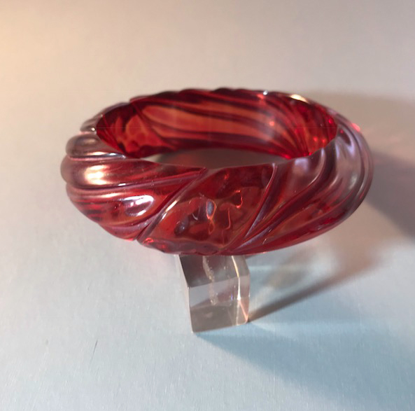 BAKELITE bangle in transparent raspberry with lovely carving of thumbprints and swirls, 2-1/2″ by 3/4″ with 1/3″ walls. Because it is an apple juice bangle overdyed with a raspberry color, it will test red with Simi-chrome, not mustard color, but it is genuine bakelite. View View View #B40342 $398.00