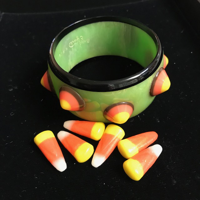 BRAD ELFRINK of Elvenkrafte Studio bakelite bangle in lime green marbling with edges of black and dots that are black, orange and yellow, like candy corn, a really fun and unusual one. It is 2-1/2″ by 1-1/2″ with 1/2″ thick walls. It is signed inside, “Brad Elfrink 6-9-16”. View View View View View #B40772 $358.00