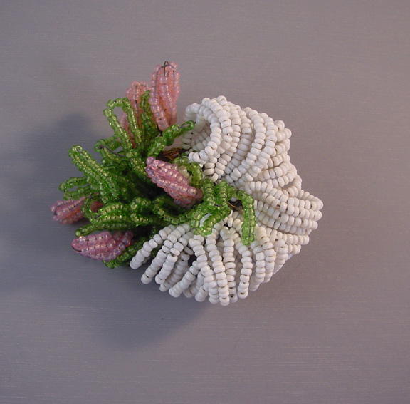 HATTIE CARNEGIE flower brooch with white, pink and green glass seed beads set in gold tone, 2-1/2″. This same piece was in Christie Romero’s book “Warman’s Jewelry, 3rd Ed, page 190. Years ago when I first got this brooch it had a Carnegie tag attached, but over the years it has gone astray. The last … Continue reading “HATTIE CARNEGIE flower brooch with white, pink and green glass seed beads”