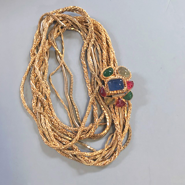 HATTIE CARNEGIE glowing aqua, blue and green glass cabochons bracelet, 7″ by 5/8″ with safety chain. As you can see in the pictures, these stones seem to be lit from within, really gorgeous. Made in the 1960s, some stones have a darker place in the bottom of them that you can see only if you … Continue reading “HATTIE CARNEGIE glowing aqua, blue and green glass cabochons bracelet”