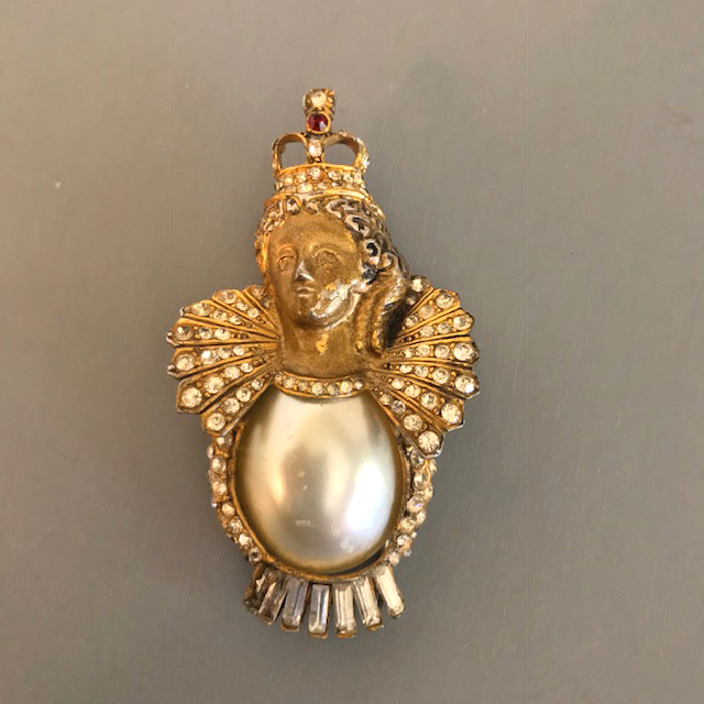 HC CARNEGIE royal Emperor and Empress king and queen fur clips with milk glass bellies and clear rhinestone accents in a lovely matte gold plated setting, made in about 1942. Both regal pieces have the earlier “HC” mark for Hattie Carnegie on the back. The king is 2-1/4″ by 1-1/4″, the queen 2-5/8″ by 1-1/2″. … Continue reading “HC CARNEGIE royal Emperor and Empress king and queen fur clips with milk glass bellies and clear rhinestone accents”