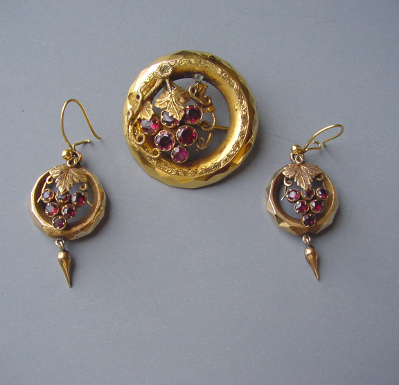 VICTORIAN garnet set of 9 carat yellow gold and garnets set in a grapes and grape leaves motif onto open circles. A beautiful motif and nice that it is a matching set as well! It includes a brooch and dangle earrings, brooch 1-1/4″ earrings 2″ total length. This will come in a vintage gray velvet box … Continue reading “VICTORIAN 9 carat yellow gold and garnet set”