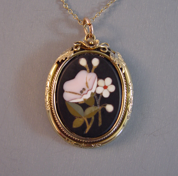VICTORIAN pietra dura set into a small wood box with flowers including white flowers, lily-of-the-valley and a morning glory with green leaves, 3-1/3″ by 2-5/8″ by 1-1/2″ tall. It’s in excellent condition, both inside and out, and has a hinged lid. View View #V33576 $348.00