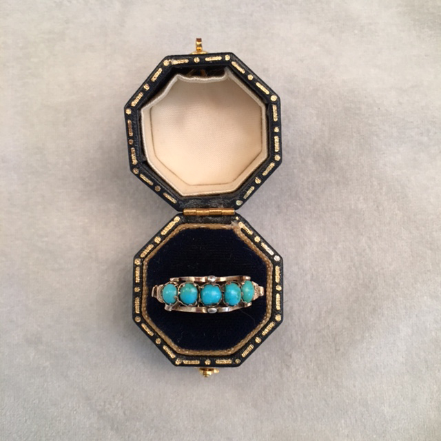 VICTORIAN Dupuis pietra dura box with flowers including a pink rose, turquoise forge-me-nots and green leaves on ebonized carved wood sides, bronze colored metal accents and a navy pleated fabric interior, 3-1/2″ by 2-5/8″. The latch clicks together firmly, and the condition is excellent except for wear on the outer bottom, as can be seen … Continue reading “VICTORIAN Dupuis pietra dura box ring or jewelry with flowers”