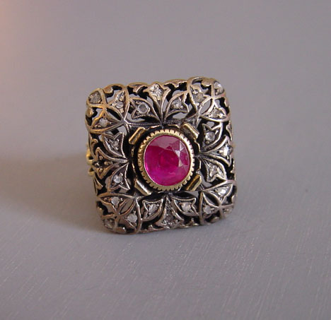VICTORIAN Bohemian garnet necklace with stars and drops, 17-1/2″ by 1-1/2″ front drop. Every garnet is rose cut by hand and there are both round and teardrop shapes. There is one tiny professional repair on the back, stable and well done. A very similar necklace can be seen in the 1899 Benjamin Allen Catalogue HERE. … Continue reading “VICTORIAN Bohemian garnet necklace with stars and drops”