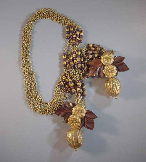 MIRIAM HASKELL by Frank Hess lariat necklace with carved wood leaves, gold painted walnuts and gold tone metal flowers with fur clip ends and gold tone chains. The lariat is a total length of 27″, and each clip is 3″. A Frank Hess for Miriam Haskell, it is unsigned as was typical for this era, … Continue reading “MIRIAM HASKELL by Frank Hess lariat necklace with carved wood leaves, gold painted walnuts and gold tone metal flowers”