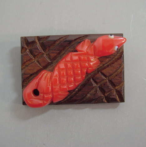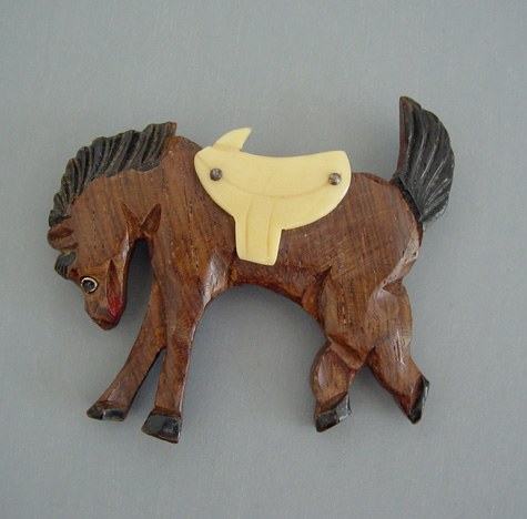 WOOD carved bucking bronco horse figural brooch with carved celluloid saddle, 3″. This piece can be seen on page 79 of “Wooden Jewelry” book by Mary Jo Izard. View #w64036 $48.00