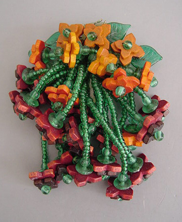 HASKELL Hess early unsigned dress clip with wood florets and green glass beads, 3″. A Frank Hess for Miriam Haskell, it is unsigned as was typical for this era, circa 1940. A similar piece can be seen in “Miriam Haskell Jewelry” by Gordon & Pamfiloff, page 145. View #H26700 $195.00