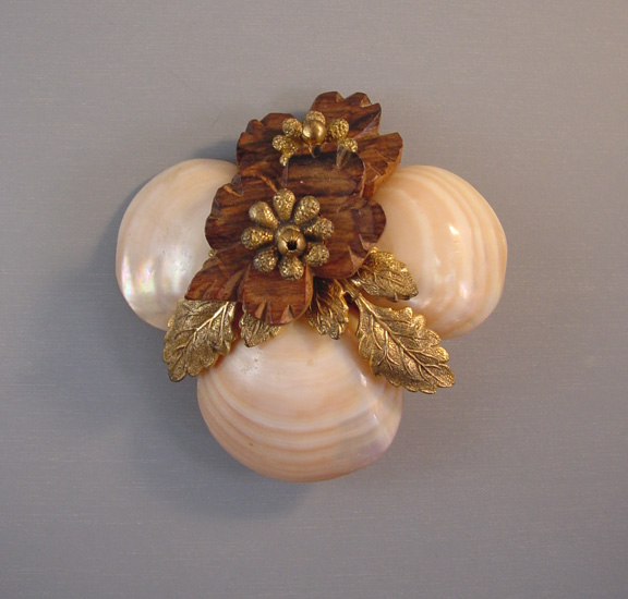 MIRIAM HASKELL Hess carved wooden flowers and sea shells brooch with gold tone leaves as accents, 3″. Haskell used some lovely sea shells in her jewelry during the war years circa 1940, and Frank Hess was her head designer during that period. View #H37626 $198.00