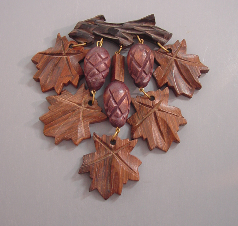 WOOD carved leaves and pinecones dangles brooch dangling on a wooden carved log, this is a large one at 4-5/8″ long, a woodsy delight circa 1940. #w65226 $38.00