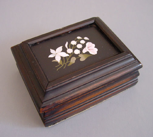 VICTORIAN pietra dura set into a small wood box with flowers including white flowers, lily-of-the-valley and a morning glory with green leaves, 3-1/3″ by 2-5/8″ by 1-1/2″ tall. It’s in excellent condition, both inside and out, and has a hinged lid. View View #V33576 $348.00