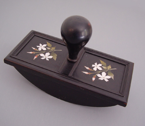 PIETRA DURA and ebonized wood Victorian antique rocker blotter, 5-3/4″ by 2-3/4″ by 4″ high. Two plaques on the top have lovely white and rose flowers with green leaves, a wonderful bouquet. In excellent condition, a true beauty. It would be a utilitarian desk accessory for a lover of calligraphy. View #a34959 $398.00
