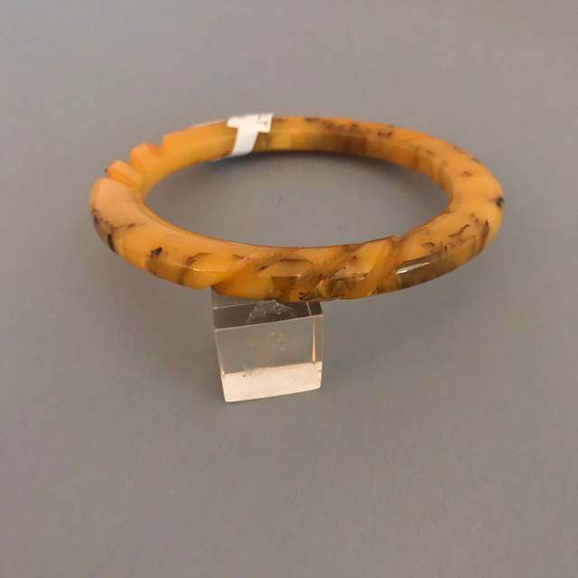 BAKELITE corn colored bangle with smooth thumbprint carving, 2-1/2″ by 3/4″ with 1/4″ walls. The soft tumbled carving casts such lovely shadows and this is a nice versatile bangle that combines well in lots of different stacks. #B37951 $198.00