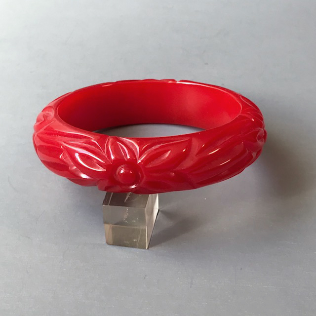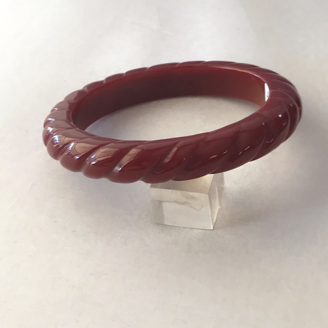 BAKELITE red smooth thumbprint carved bangle, 2-1/2″ by 3/4″ by 1/3″. The soft tumbled carving casts such lovely shadows and this is a nice versatile bangle that combines well in lots of different stacks. View #B40473 $198.00