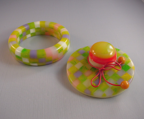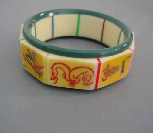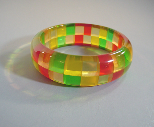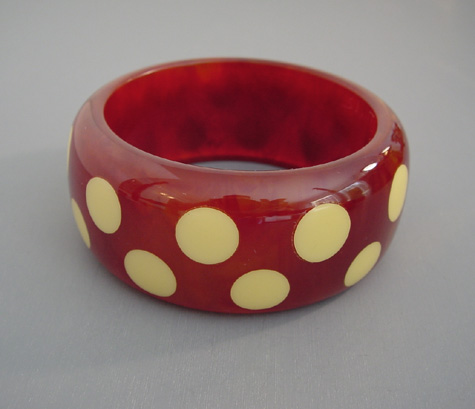 SHULTZ bakelite cream bangle with red, white and green bull’s eye dots, 2-1/2″ by 3/4″ by 1/3″. Artisan Ron Schultz, who began making his wonderful bakelite jewelry in the 1980s, creates his pieces using only genuine vintage circa 1940s bakelite, and every piece is his own original work. This was made prior to 2010. It … Continue reading “SHULTZ bakelite cream bangle with red, white and green bull’s eye dots”