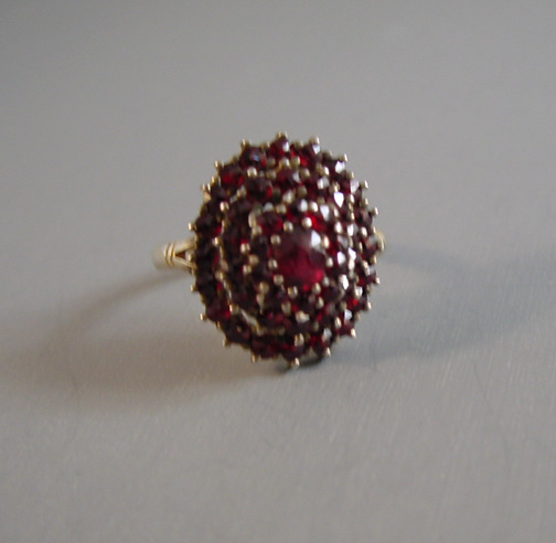 BOHEMIAN garnet and gilt sterling domed oval ring with four tiers, marked inside “900” for 900/1000 gilt sterling silver. The center stone is a faceted oval and the rest are rose cut garnets, size 7-1/2″ and top is 5/8″ by 1/2″. View View #Q37719 $138.00