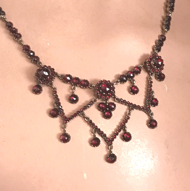 BOHEMIAN GARNET necklace with dangling garnets at the bottom of the design, 16+” wearable length and 1-1/4″ drop in the front. The lacy open design and the trembling drops make this even more special, and it has a small box clasp. A necklace similar to this can be seen in the 1899 Benjamin Allen Company … Continue reading “BOHEMIAN GARNET necklace with dangling garnets at the bottom of the design”
