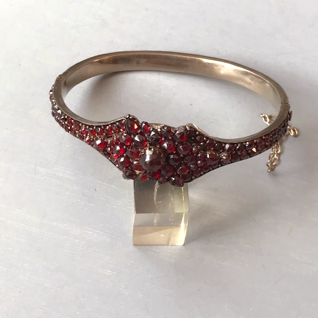 BOHEMIAN GARNET wine red stones in a hinged bracelet with an original safety chain. The garnets here are a rich lovely color. It is 7″ around the inside and the front element is 1-3/4″ across and 5/8″ from top to bottom, and it is 2-1/3″ by 2″ across the inside. The last photo is from … Continue reading “BOHEMIAN GARNET hinged bracelet with an original safety chain”