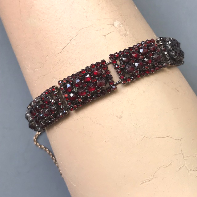 BOHEMIAN GARNET bracelet with 12 square links each encrusted with two sizes of prong set garnets in a silver metal, 7″ by 1-2″. The bracelet has a safety chain and in wonderful condition in every way. Made in early the 1900s, garnets are still popular today View View View View #V42337 $128.00
