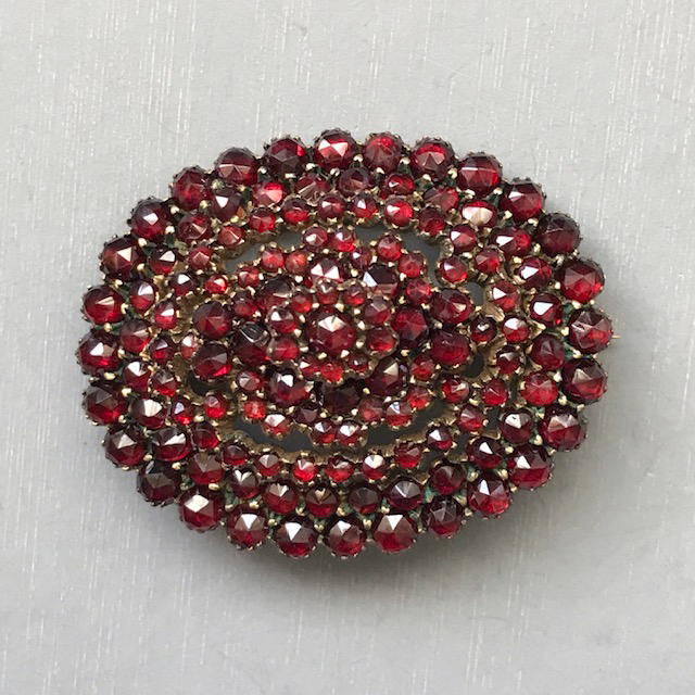 BOHEMIAN GARNET oval brooch with rich red garnets set in four stacked layers and in a gold plated setting. This is a nice size at 1-5/8″ by 1-1/3″. The pomegranate red color of the garnets is beautiful, and they completely cover the entire top of the brooch, encrusting it in a lovely way. The last … Continue reading “BOHEMIAN GARNET oval brooch with pomegranate red garnets set in four stacked layers”