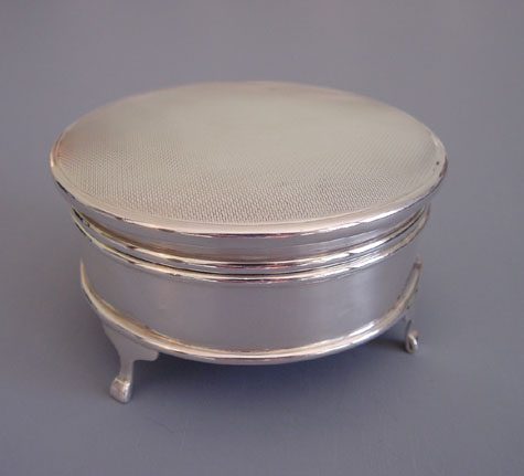 STERLING English antique three-footed jewelry box with an engine turned top, lined in the original dusty rose velvet, 3-1/2″ by 2″ tall. It is hallmarked on one side for the year 1919 and has an illegible maker’s mark as well. The lid has three dimple dents, shallow but visible, as well as a few on the sides. It … Continue reading “STERLING footed jewelry trinket box hallmarked 1919”